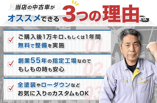 当社の中古車はプロの整備士の目で厳選し、徹底的に点検・整備を行った車両のみを販売しておりますのでご安心ください。
